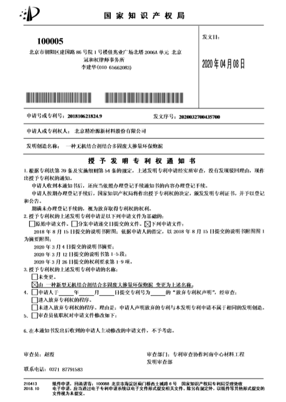近日,由北京精冶源新材料河北有限公司(簡稱:精冶源;股票代碼:831091)研發(fā)的一種新型結(jié)合劑環(huán)保炮泥喜獲國家知識產(chǎn)權(quán)局發(fā)明專利授權(quán),專利號:201810621824.9。這是精冶源在爐前炮泥領(lǐng)域獲得的第四項國家專利。 傳統(tǒng)炮泥大多以焦油或樹脂為結(jié)合劑,存在諸多缺點:焦油系炮泥在使用過程中會產(chǎn)生苯并芘,污染環(huán)境并危…
