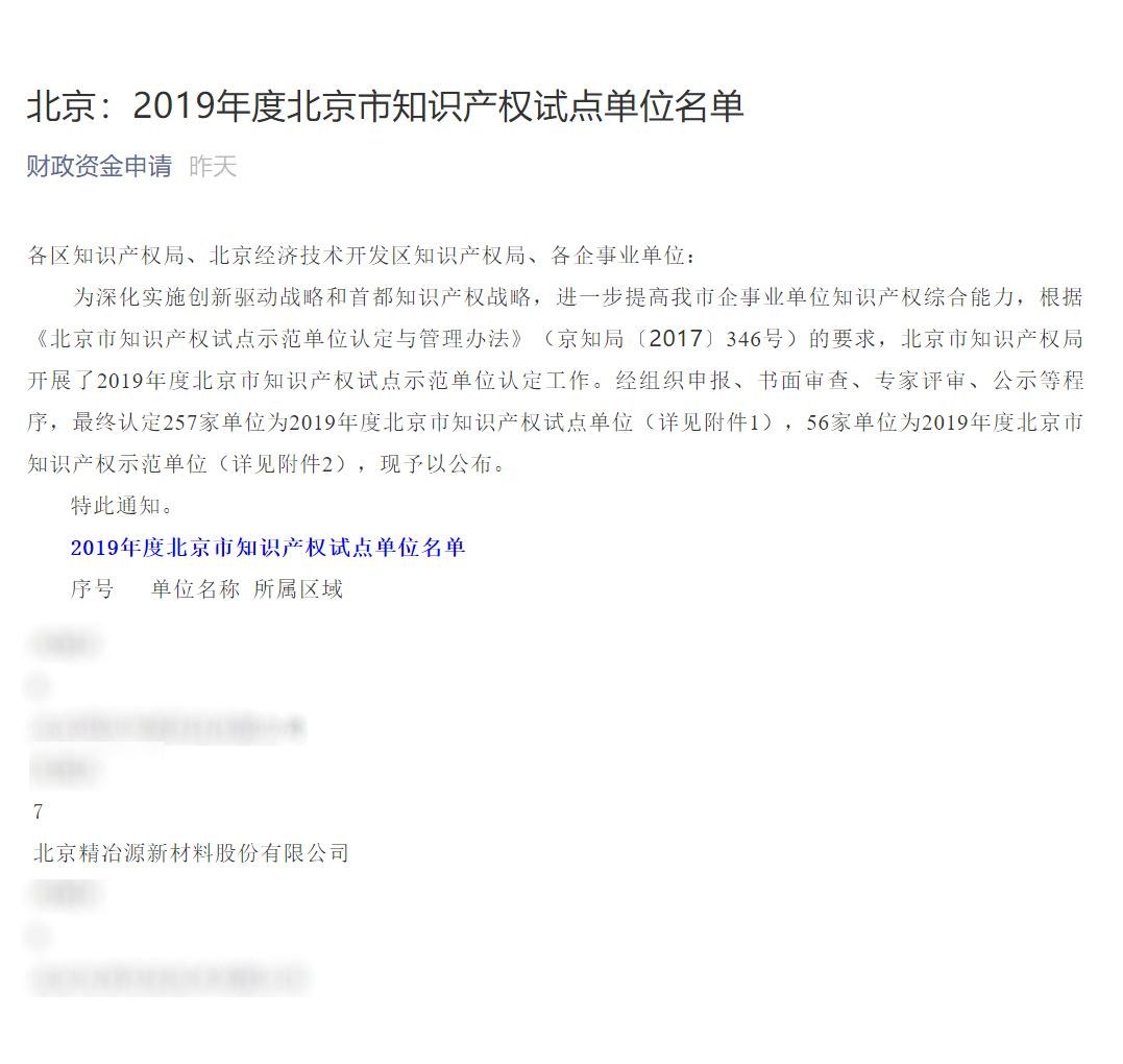2019年12月下旬,北京精冶源新材料股份有限公司(簡(jiǎn)稱:精冶源;股票代碼:831091)歷經(jīng)嚴(yán)格而規(guī)范的書(shū)面審查、專家評(píng)審、公示等多項(xiàng)程序,被北京市知識(shí)產(chǎn)權(quán)局認(rèn)定為2019年度北京市知識(shí)產(chǎn)權(quán)試點(diǎn)單位。 此次認(rèn)定要求企業(yè)屬于知識(shí)產(chǎn)權(quán)密集型產(chǎn)業(yè)領(lǐng)域,有持續(xù)創(chuàng)新活動(dòng),有一定數(shù)量的專利申請(qǐng)且近三年專利實(shí)施率不低于40%等多…